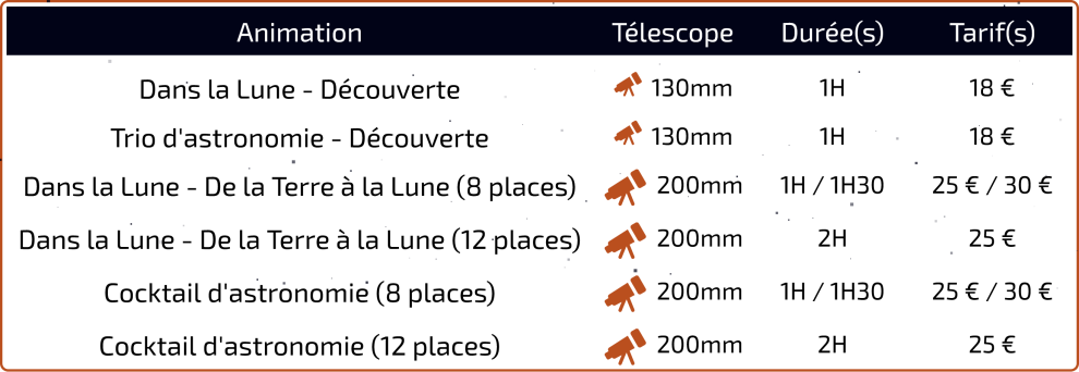 Description : Profitez d'une session dédiée à l'observation de la Lune pour contempler tranquillement sa surface.